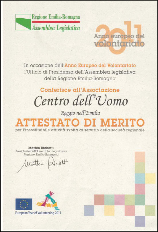 In occasione dell'Anno Europeo del Volontariato 2011, il Presidente dell'Assemblea legislativa della Regione Emilia-Romagna, Matteo Richetti, ha conferito l'attestato di merito all'Associazione Centro dell'Uomo "quale riconoscimento per l'insostituibile attività svolta al servizio della società regionale e per i valori che l'Associazione esprime e rappresenta."
