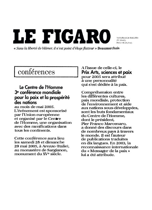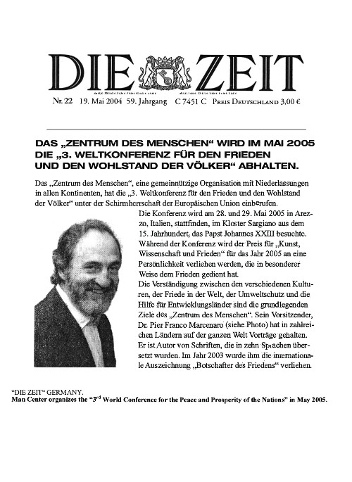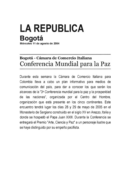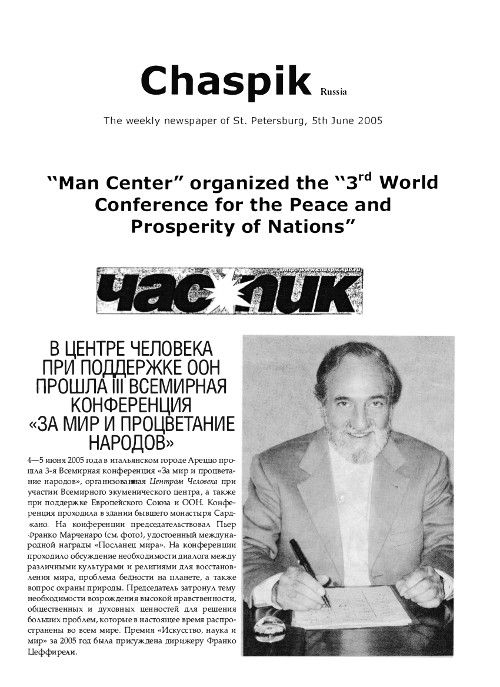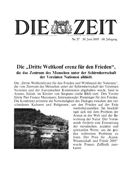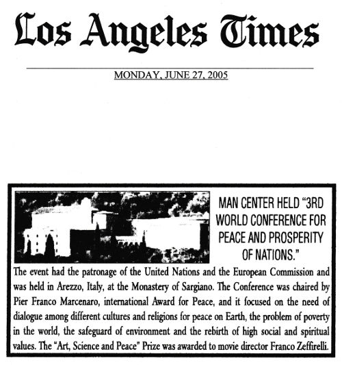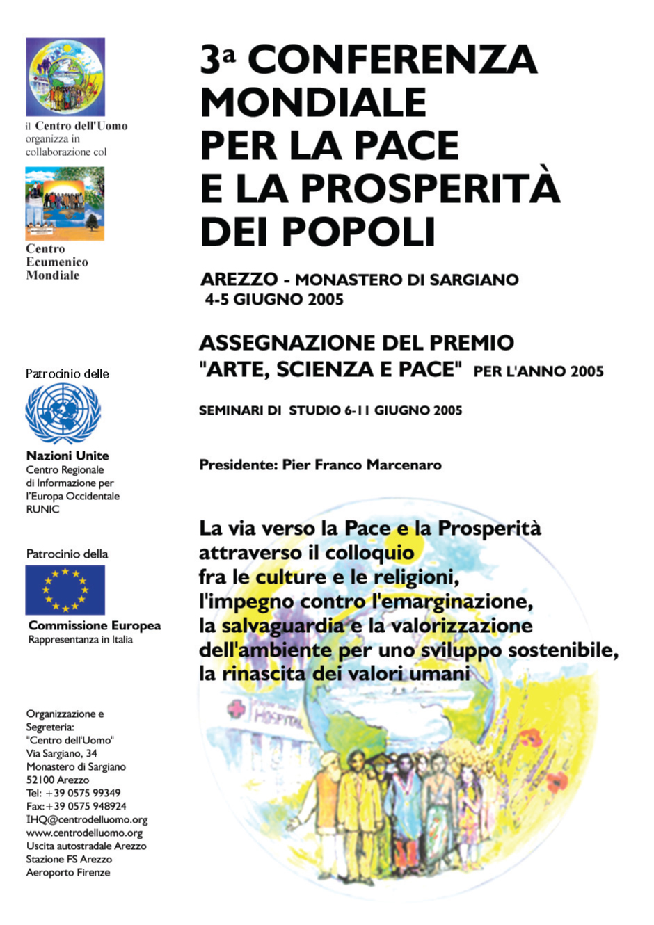 La via verso la Pace attraverso il colloquio fra le culture e le religioni, l'impegno contro l'emarginazione, la salvaguardia e la valorizzazione dell'ambiente per uno sviluppo sostenibile e la rinascita dei valori umani, sono state le tematiche della "III Conferenza Mondiale per la Pace e la Prosperità dei Popoli" che ha avuto luogo ad Arezzo, nello storico Monastero di Sargiano, dal 4 al 11 Giugno 2005 col Patrocinio delle Nazioni Unite e della Commissione Europea.