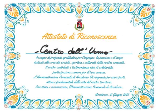 Il 21 Giugno 2025 il Centro dell'Uomo ha ricevuto da parte dell'Amministrazione Comunale di Arcidosso (GR) un importante Attestato di Riconoscenza per la dedizione e il contributo dell'Associazione alla crescita sociale, sportiva e culturale della Comunità locale.